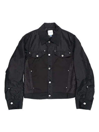 black front button fastening two chest flap pockets two side welt pockets buttoned cuffs