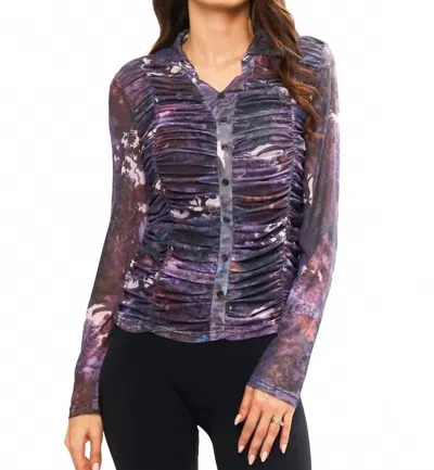 This button down shirt is comfortable yet polished.Introducing the Ruched Button Down Top by Adore, a stunning piece featuring a mix of purple hues and abstract patterns. This long sleeve top is crafted from 92% polyester and 8% spandex, offering a sheer mesh that adds sophistication to any ensemble. Measuring 24 inches in length from the shoulder, it includes a classic button closure and a collar neckline. Made with care, this top requires a gentle hand wash and line drying. Model is 5'10" with measurements 34" bust, 26" waist, 36" hips and wears a size small. Note - Runs small.