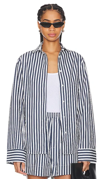 AEXAE Button Up Shirt in Stripe - White. Size M (also in L, S, XS, XXS). 100% cotton. Made in China. Hand wash. Front button closure. Button cuffs. Lightweight poplin fabric. Item not sold as a set. AEXR-WS18. AX3005. About the designer: