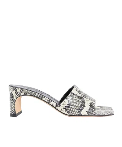 Aeyde "Jeanie" snakeembossed leather mule sandals 2.25 in / 55 mm narrow block heel Open toe Wide band upper Slide style Leather outsole Lining: Leather Made in Italy