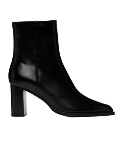 Pointed, inside zipper opened and closed, followed by red stitches.
