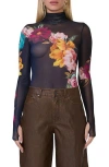 Zadie Print Turtleneck Mesh Top In Navy Color Block Floral