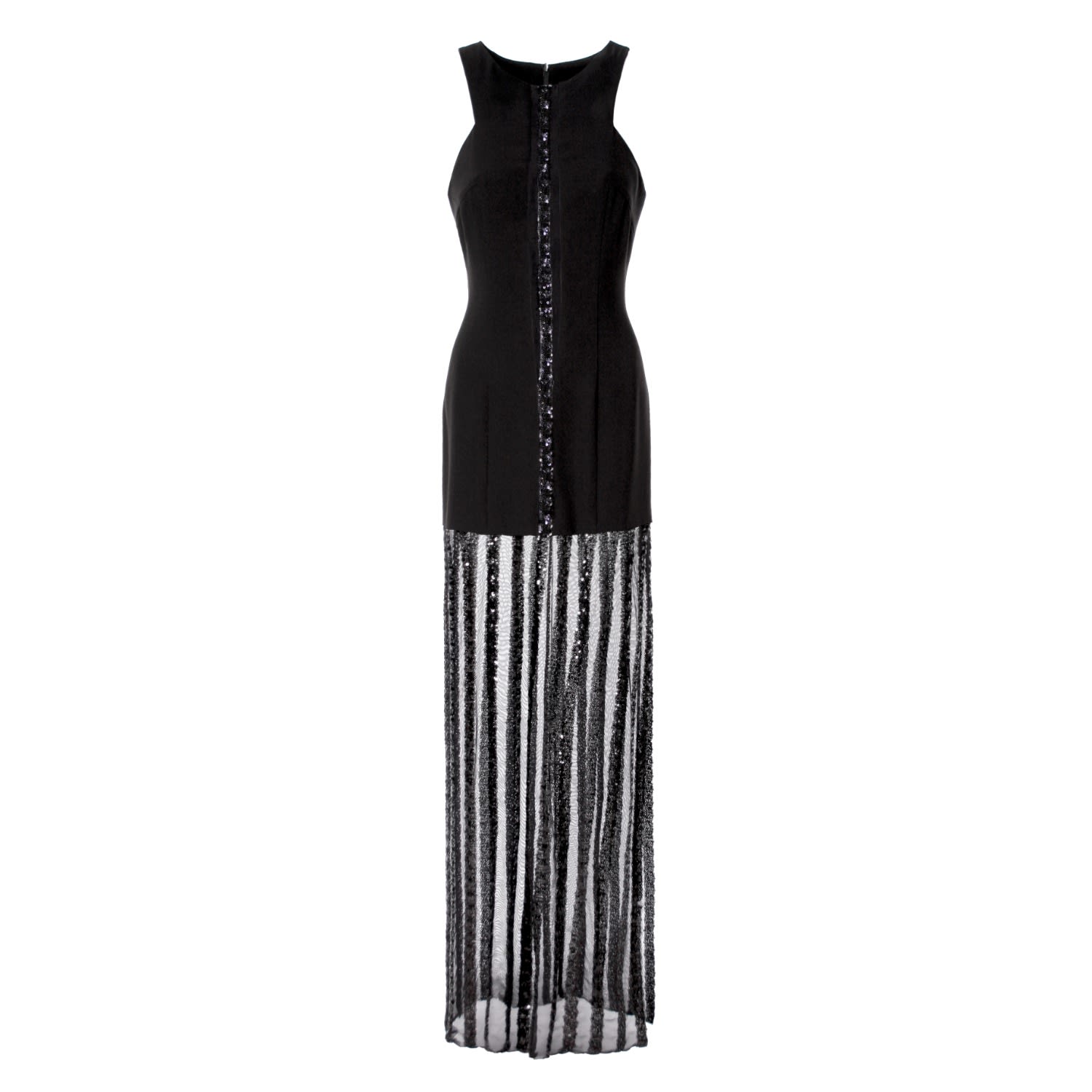 Sleeveless evening dress with a fitted cut and a slit on the side. The combination of two materials combines two lengths: mini and maxi. The upper part of the dress with an interesting cut around the shoulders. The lower part is made of a delicate mesh with sequins.