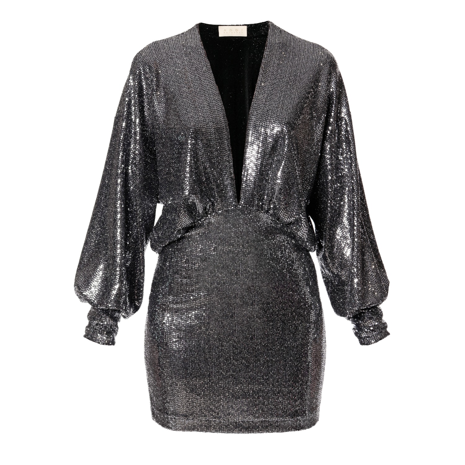 A unique mini dress crafted from an elastic material infused with a metallic thread and adorned with shiny paillettes that reflect light, creating a stunning sparkle during movement. The dress's elastic properties allow it to adapt beautifully to the body, ensuring a perfect fit. The deep neckline gracefully extends down to the waistline, while luminous long sleeves are gathered at the wrists. The bottom of the dress hugs the waist and hips, completing the stylish silhouette.Length from the highest point on the shoulder: approximately 88cmHip circumference: 92cm (XS), 96cm (S), 100cm (M), 104cm (L)Chest circumference: 84cm (XS), 88cm (S), 92cm (M), 96cm (L)Waist circumference: 64cm (XS), 68cm (S), 72cm (M), 76cm (L)The model's height is 173cm, and she wears an XS-size.