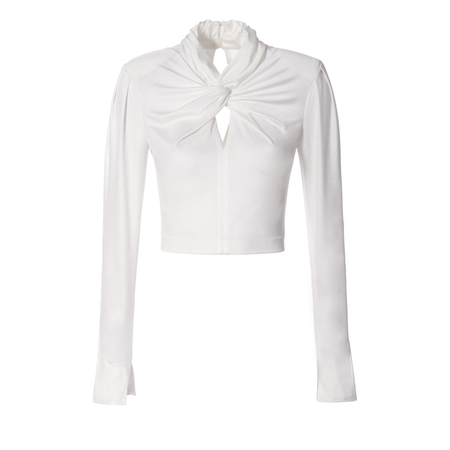 Long-sleeved crop top made of elastic fabric with a subtle sheen, softly emphasizing the silhouette. The neckline with a delicate cutout is decorated with a knot made of abundantly gathered material, crossing under the neck. Long tear-shaped cutout at the back, finished with a fastening with small pearl buttons. Wear it with Krisitin White Pear Skirt. Please refer to the detailed table of our sizes in the SIZE GUIDE and our detailed measurements which you can find in the SIZING tab, for choosing the best fit. Hand wash with delicate detergents Do not wring out Do not iron COMPOSITION: 47% Viscose, 41% Modal, 12% Spandex