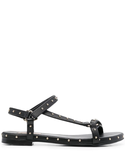 stud-detailing open-toe sandals from AGL featuring black, calf leather, stud embellishment, open toe, ankle touch-strap fastening, branded insole and flat rubber sole.