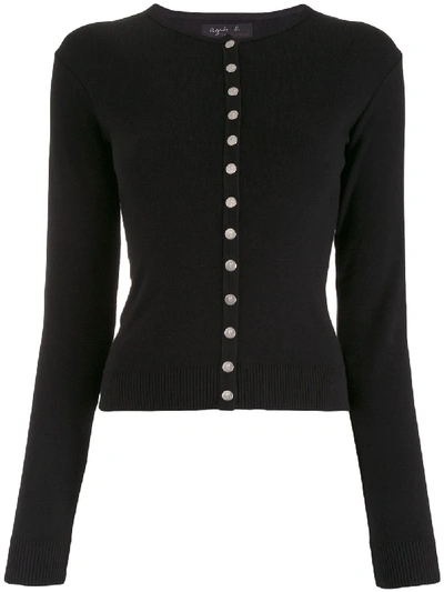 Black cotton Swing snap cardigan from agnès b. featuring long sleeves, ribbed cuffs, ribbed hem, slightly fitted silhouette, round neck and logo-engraved press stud fastening.