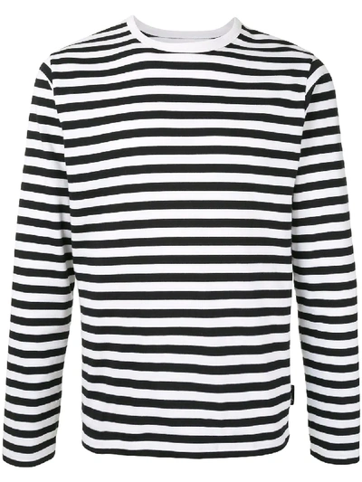 Black/white cotton Coulos stripe T-shirt from agnès b. featuring round neck, horizontal stripe pattern, long sleeves, logo print to the front and straight hem.