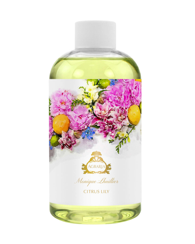 Agraria 8 oz. Citrus Lily Diffuser Refill Refill AirEssence or PetiteEssence Diffusers with your favorite blend of perfume-grade natural and essential oils. Bright citrus top notes from California lemons and Italian bergamot mingle into a lush floral bouquet of lilies, freesia, ylang-ylang, gardenia and jasmine. Indian sandalwood and exotic musks are folded in to create this boldly fresh and romantic fragrance. 8 oz./ 236.5 mLDesigner About Agraria: Since 1970, Agraria has been enchanting cus.