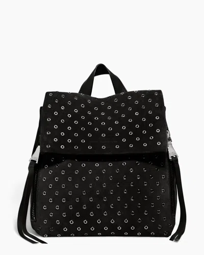 Crafted of suede with leather trim, the Bali backpack from Aimee Kestenberg is designed with the label's signature double-entry flap concealing a hidden pocket. Multiple compartments and adjustable straps highlight its functional construction. Top handle Adjustable backpack straps Exterior: one back slip pocket and two front zip pockets Interior: one zip pocket and two slip pockets Side gusset snap for size adjustability Protective dome feet Fla. Center Core - Handbags/slgs > Saks Off 5th. Aimee Kestenberg. Color: Black With Eyelets.