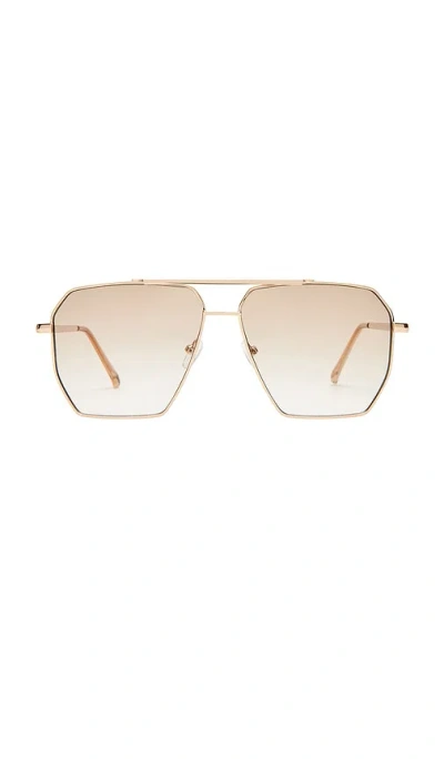AIRE Asteroid Sunglasses in Metallic Gold. Metal frames. Lens measures approx 60mm. Bridge measures approx 15mm. Arm measures approx 135mm. Faux leather frog mouth case included. EIAA-WG88. AIR2542245.