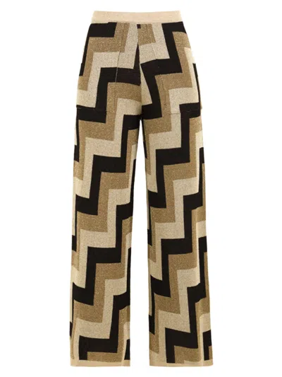 Knit palazzo pants with an eye-catching zig-zag pattern in vibrant tones. The knit fabrication gives the garment a sophisticated and versatile touch. 70% VISCOSE 20% METALLIC FIBER 10% POLYAMIDE.