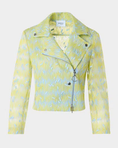Akris punto reimagines a classic silhouette with this cropped biker jacket, featuring a vibrant, textured scribble motif on semi-sheer mesh for a modern, artistic edge. Notched collar Long sleeves Cropped fit Asymmetric zip front Polyester Dry clean Made in Romania SIZE & FITModel measurements: 5 & apos;10" tallModel is wearing a US size 4/Small