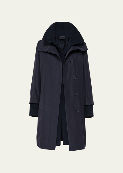 Akris storm system coat. Double-breasted button front. Silk; trim, wool/cashmere/. Lining, cupro. Dry clean. Imported.