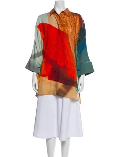 Akris Wool Blouse Neutrals Patterned Three-Quarter Sleeve Fit: Tops by Akris typically fit small, consider taking a size up. | Akris Wool Patterned Blouse in Neutrals, Women's L