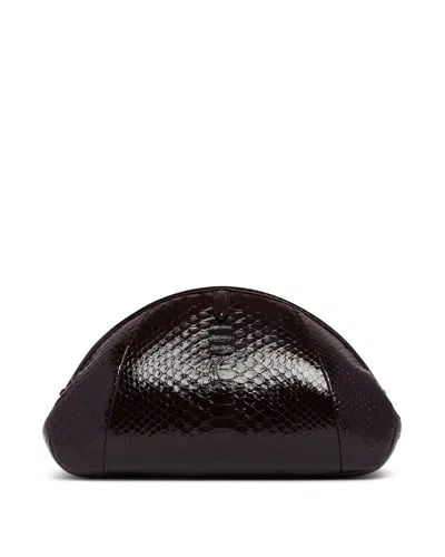 Alaia Burgundy Python Clutch. Burgundy python leather, semicircular bowling bag-inspired silhouette, snap closure, leather lining. Size (cm): 34X19X12