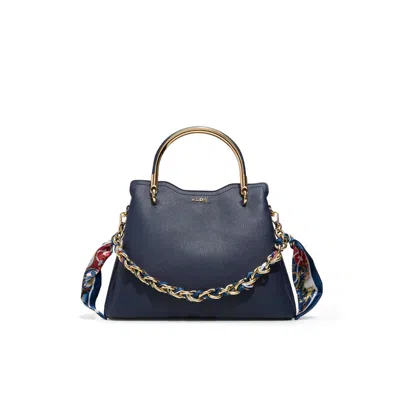 Curved gold-tone handles crown this structured pebbled satchel, while a chunky chain threaded with a colorful scarf strap flips its vibe from executive polish to weekend play in one click. Carry it with a tailored blazer for coffee briefings, or sling it over a floral midi at art-fair strolls, sealing every outfit with effortless shine. - ALDO. Color: Navy.