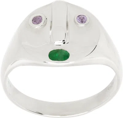 Handcrafted signet ring in sterling silver. · Embossed graphic at face · Bezel-set pink sapphires and emerald · Full British hallmarking Available exclusively at SSENSE. Supplier color: Multi