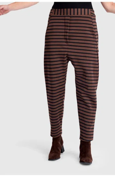 These striped harem pants feature a drop crotch and tapered ankle for directional shape. With a slim relaxed fit and comfortable elastic waist, they deliver laid-back structure in a graphic palette. Slim relaxed fit, for a baggier look size up Midweight french terry Mid-rise drop crotch pant that tapers in at ankle Elastic back waist, side pockets, back pockets, mock fly