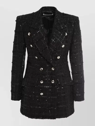 Classic cut with structured, padded shoulders | Hem falls above the hips | Versatile for formal or casual outfits | Textured fabric | Elegant refined design in black | Two front flap pockets | Button detailing | Double-breasted closure with branded buttons