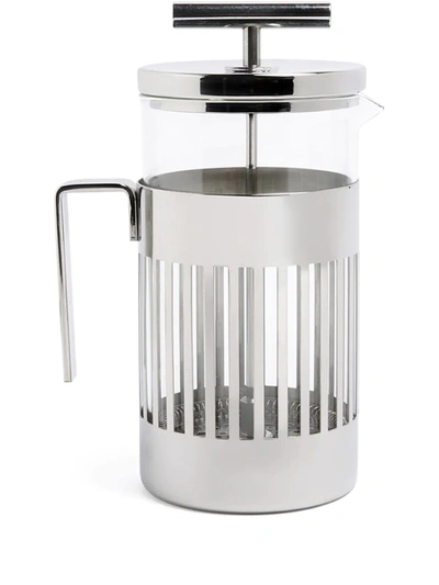 Silver-tone stainless steel press filter coffee maker from Alessi featuring a top handle, a side handle and a glass design.