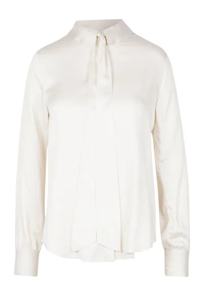 Sateen shirt. Toe collar with tapes to be knotted frontally. Long sleeves with cuffs and button at the bottom. Front closure with buttons. Carre straight on the back with light curling. Fabric composition: 100% viscose. Fit: regular. Made in Italy. The model wears size 38 and is 175 cm high. We love this shirt for smooth fabric and easy-chic touch.