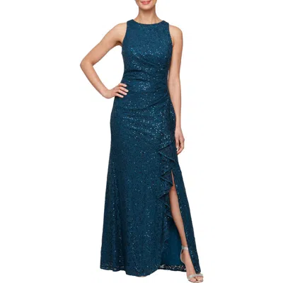 ALEX EVENINGS Ruffle Sequin Lace Gown In Deep Teal