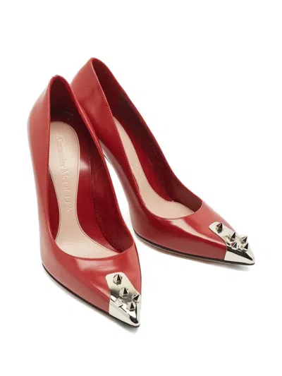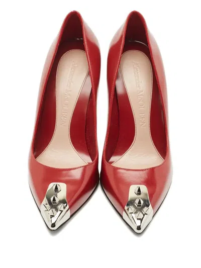 red leather spike embellishments pointed toe stiletto heel silver-tone toe cap This piece comes complete with a protective dust bag. Condition: EXCELLENT. This previously owned item is in near-perfect condition with no signs of damage or use.