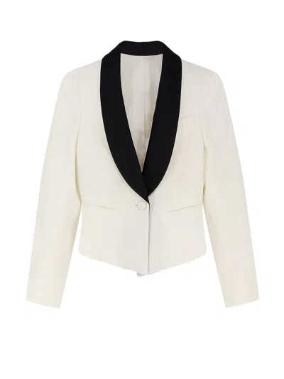Single covered button closure Contrasting satin lapel Fitted Front welt pockets Made in Italy 100% wool Lining: 100% cupro SKU: 847009QJAAC9016. Colour. : SOFT WHITE. Composition. : 100% lana. Country Of Manufacture. : ITALIA. MPN. : 847009QJAAC9016. .