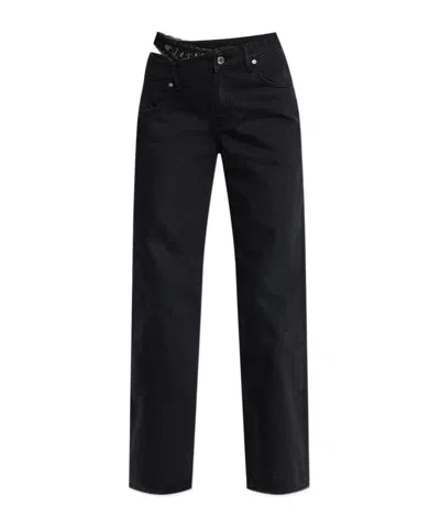 Decorative inserts, five-pocket styling, front pocket decorated with metal rivets.