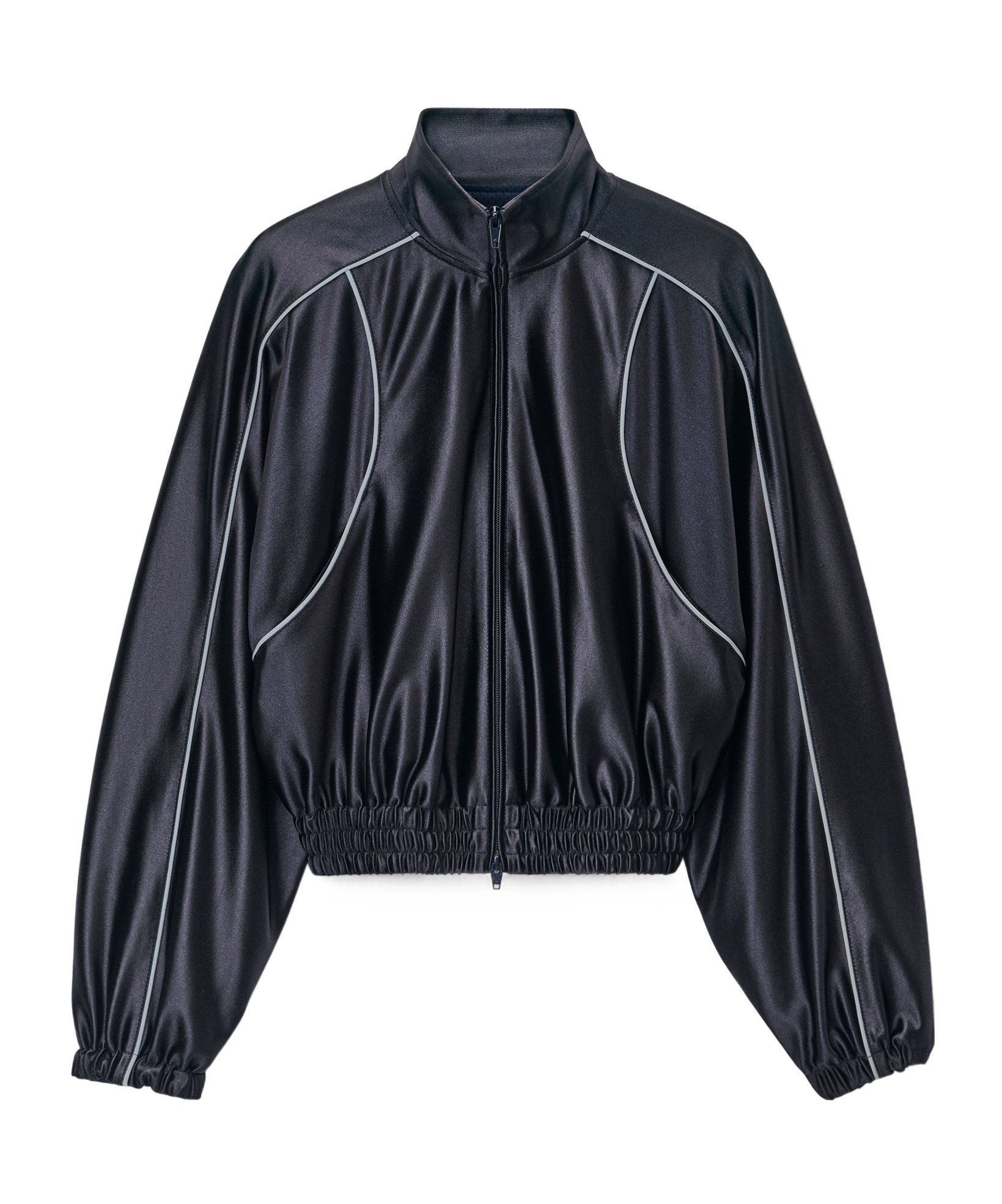 Contrast piping hightlights the curved panels of this cropped track jacket crafted of stretch-enhanced jersey and framed with balloon sleeves. Front zip closure Stand collar Elastic cuffs and hem Mesh lining 91% polyester, 9% elastane Machine wash, line dry Imported Designer Clothing