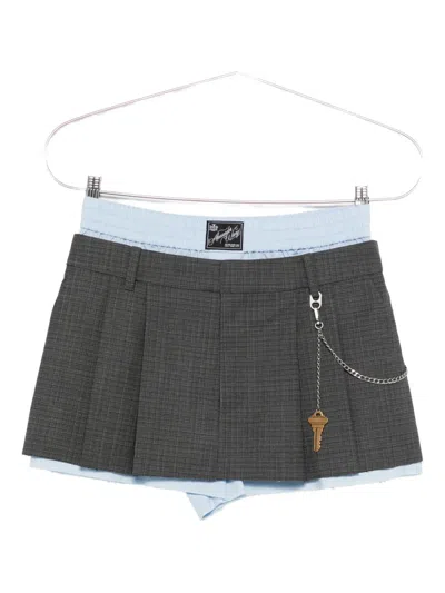 Alexander Wang grey wool blend mini skirt with elastic mid waistband, logo patch detail, belt loops, hook and zip closure, front pin tucks, silver metal chain on the side, logo key charm detail, two side pockets, two back welt pockets, straight hem. Composition: 86% Wool, 10% Polyamide, 4% Elastane