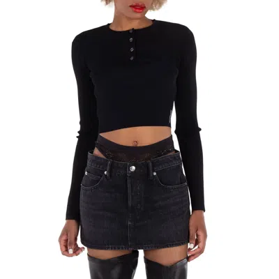 T by Alexander Wang Ladies Tops. Fashion category - Shirts & Blouses. SKU - 1KC3241060-BLACK. Color - Black. T by Alexander Wang Ribbed-Knit Double Layer Top. Crafted from ribbed stretch fabric, this set includes a fitted short top with adjustable thin straps and a side logo label, paired with a super-cropped cardigan for a sleek silhouette. Viscose 59%, Polyamide 38%, Elastane 3%.