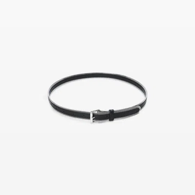 40mm/1.5" crinkle leather belt with zipper teeth trim around the edge. Finished with a roller buckle engraved with our logo and nine holes for high- or low-waist adjustability.. Black/Silver . 9-hole adjustability for high- or low-waist wear. Unlined with natural leather backing. Made in Vietnam. Width: 25 mm (1 in). Available sizes: 70, 80, 90. Made in Vietnam. 20126B70L012C.