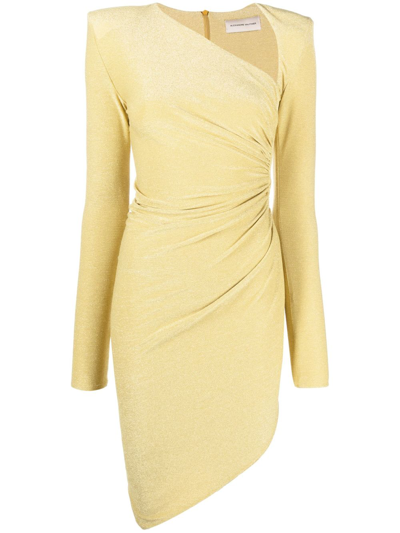 Amber yellow metallic-sheen asymmetric fitted dress from ALEXANDRE VAUTHIER featuring metallic threading, draped design, asymmetric neck, concealed rear zip fastening, shoulder pads, long sleeves and asymmetric hem.