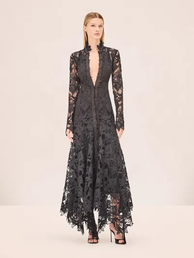 The Camila Dress is a long sleeve midi silhouette crafted in floral lace, featuring a plunging neckline.