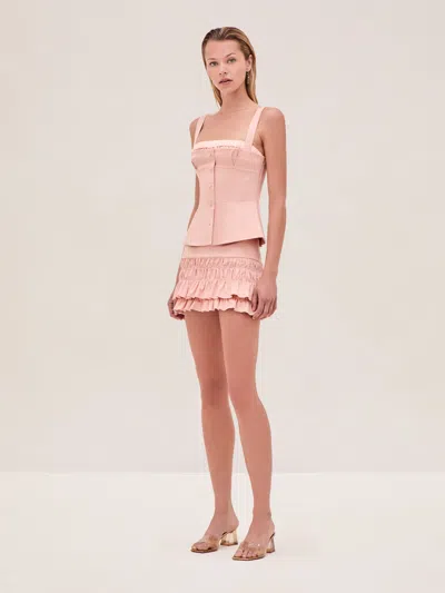 The Ezza Top is cotton poplin button-down featuring delicate scrunched ruffle detailing, paired with the Cosi Skirt .