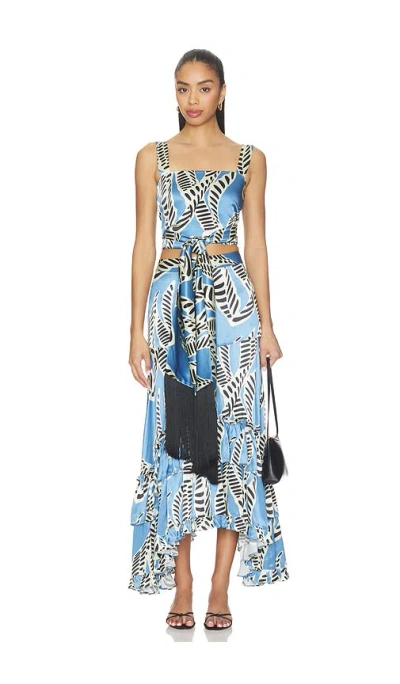 Alexis Keen Top in Blue,Cream. - size XS (also in L, M, S) Alexis Keen Top in Blue,Cream. - size XS (also in L, M, S) Self: 58% viscose 42% rayon Lining: 100% polyester. Made in China. Dry clean only. Self tie closure. Fringe design. Midweight satin fabric. Item not sold as a set. AXIS-WS466. A1260113-1044. A luxurious clothing line born out of Miami and brain child of designer Alexis Barbara, the collection is influenced by Mediterranean travels and designed for those who are delicately sophisticated and truly fashion forward.
