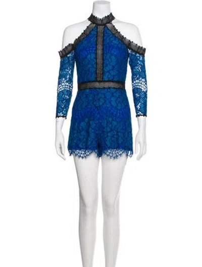Alexis Romper Black & Blue Lace Pattern Lace, Embroidered & Cutout Accents Three-Quarter Sleeve with Mock Neck Concealed Zip Closure at Back Fit: Jumpsuits and Rompers by Alexis typically fit true to size. | Alexis Lace Pattern Mock Neck Romper in Black/Blue, Women's S