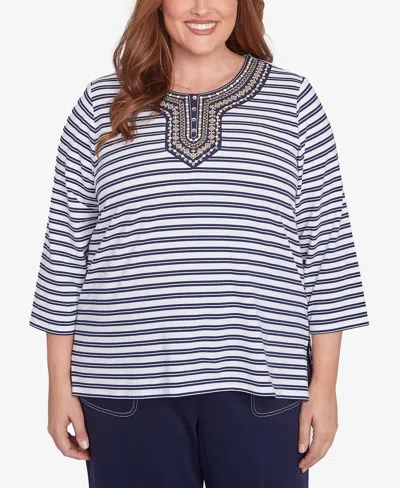 ALFRED DUNNER Plus Size Block Island Striped Top With Embroidered Neckline In Navy Multi