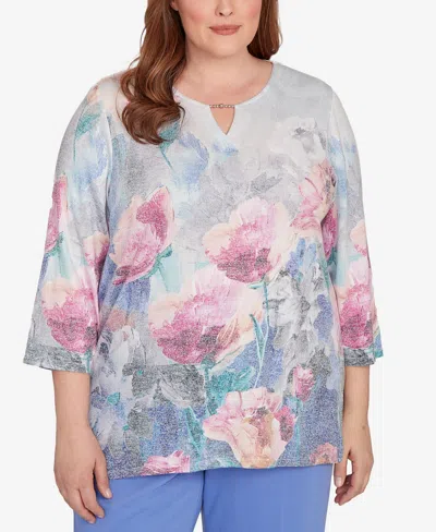 ALFRED DUNNER Plus Size Casual Vibe Floral Brushstroke Beaded Split Neck Top In Multi