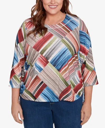 ALFRED DUNNER Plus Size Classic Stripe Patchwork Ruched Sides Top In Multi