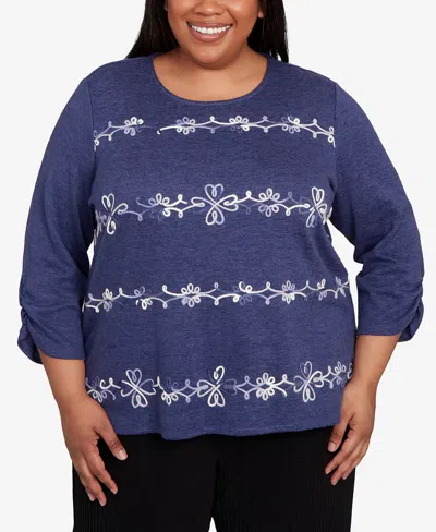 ALFRED DUNNER Plus Size Lake Champlain Embroidered Scroll Ruched Sleeve Top In Purple