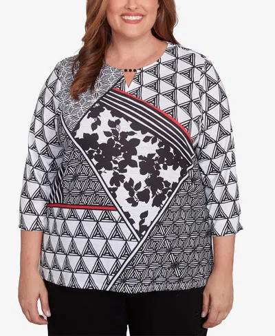 ALFRED DUNNER Plus Size Wild At Heart Geometric Multi Textured Patchwork Top In Black,white