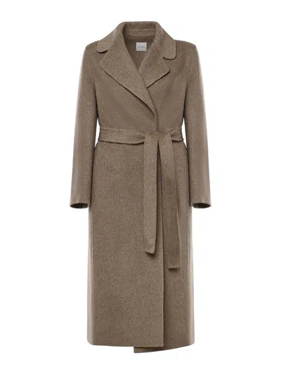made of pure wool, matching tie belt, lapel collar, back slit, long sleeves, regular fit, the size shown in the photo is 38, designer color: beige melange