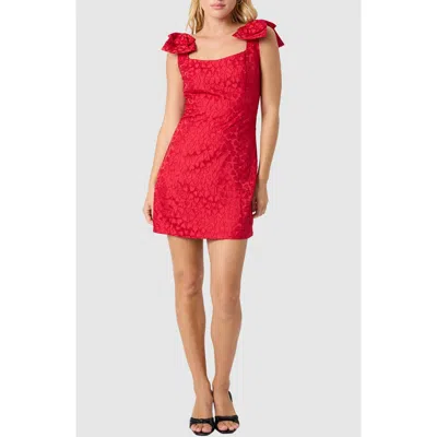 Show some love in this sheath minidress featuring adorable bow-topped straps and a tonal jacquard pattern exploding with hearts. 32" length Back zip closure Scoop neck Sleeveless Lined 100% polyester Dry clean Imported