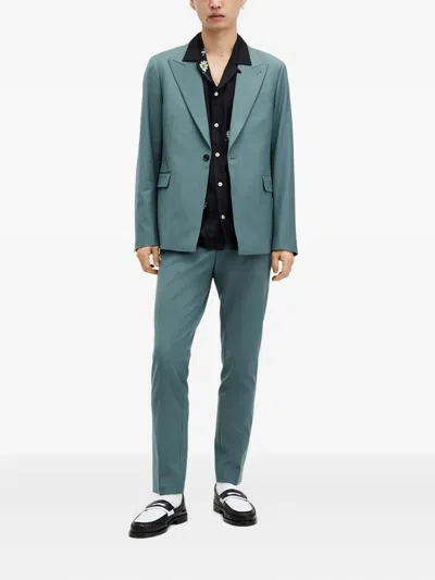 petrol blue single button fastening peak lapels front flap pockets plain weave