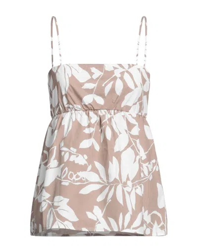 plain weave, frills, floral design, wide neckline, sleeveless, no pockets , Color: Light brown , Size: 8