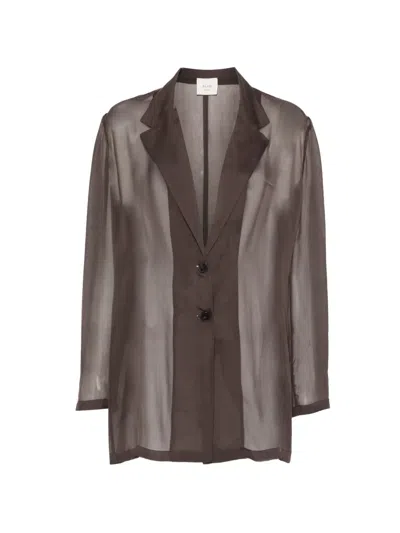 brown button fastening lapel collar sheer design