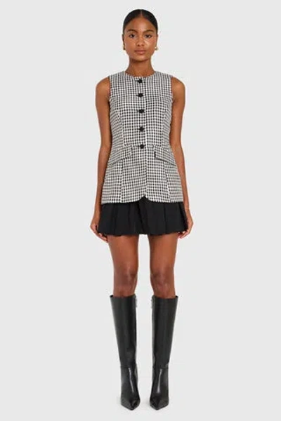 Make power moves in the Clark Romper. Featuring a long-line fitted houndstooth vest bodice and a flouncy pleated skort peeking out underneath, this mini is an instant classic for fall. Pair with knee-high leather boots for an edgier look or ballet flats and cute ankle socks for a super-cute 'fit. Perfect For: Office parties, study dates, brunching with the girls. Style Details: Mini Skort Romper Crew Neck Front Button Closure At Center Right Faux Flap Pockets Pleated Skirt Invisible Zipper At Side Seam Of Inside Shorts Partial Lining 100% Polyester Dry Clean Only HNCI-40258EG